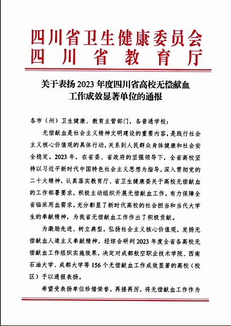 近日,四川省卫生健康委员会和四川省教育厅联合发文《关于表扬2023年度四川省高校无偿献血工作成效显著单位的通报》,鸭脖荣获“2023年度四川省高校无偿献血工作成效显著单位”称号。2023年,党委学生工作部坚持以习近平新时代中国特色社会主义思想为指导,高度重视无偿献血等志愿公益活动。认真落实教育厅、省卫生健康委及各级红十字会关于无偿献血的工作部署要求,将无偿献血作为引领大学生践行社会主义核心价值观的重要载体。多形式、...