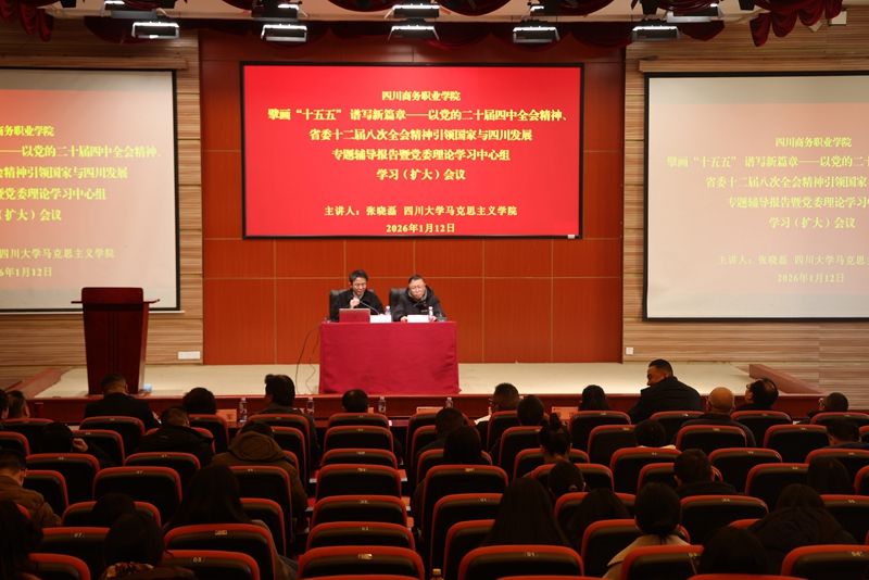 2026年1月12日下午,学院第一次党委理论学习中心组学习(扩大)会议在商务信息交流中心举行。四川大学马克思主义学院副教授、四川省中国特色社会主义理论体系研究中心研究员张晓磊应邀作“擘画十五五谱写新篇章——以党的二十届四中全会精神、省委十二届八次全会精神引领国家与四川发展”专题辅导报告。会议由党委书记唐柯主持。张晓磊副教授围绕学习贯彻党的二十届四中全会和省委十二届八次全会精神,用大量生动案例、深入浅出地分析了“...