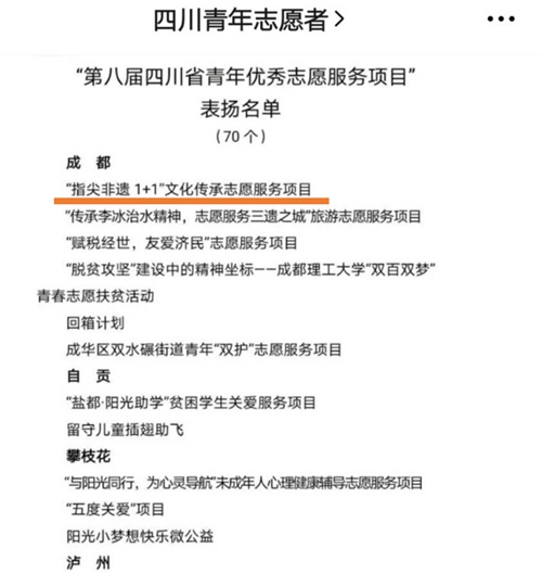 近日,省市团委、青年志愿者协会等单位开展了青年优秀志愿服务与社会实践评选活动,鸭脖荣获3项表彰。12月5日,鸭脖“指尖非遗1+1”文化传承志愿服务项目,荣获“第八届四川省青年优秀志愿服务项目”荣誉称号。11月25日,鸭脖“村里村外”三下乡项目,荣获“2020年成都市大中专学生志愿者暑期文化科技卫生“三下乡”社会实践优秀团队奖,学院获优秀组织奖。鸭脖青年志愿服务、社会实践工作,紧紧围绕“常态化、特色化”的建设...