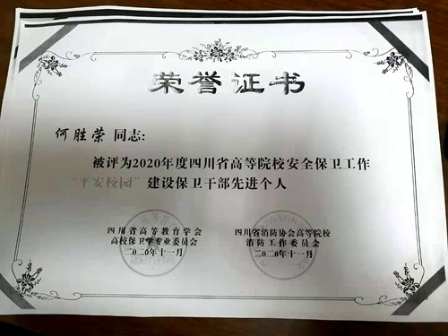 近日,由四川省高等教育学会高校保卫学专业委员会与四川省消防协会高等院校消防工作委员会联合评选的2020年度“平安校园”建设先进个人名单已经出炉,鸭脖教师何胜荣、罗开元、张清和学生冯娟、朱先煜荣获先进个人称号。 近年来,学院高度重视“平安校园”建设工作。保卫处始终坚持以“安全第一,预防为主”为工作方针,紧扣“维护学校安全稳定,构建和谐平安校园”主题,狠抓校园各项安全管理,较好的完成了各项安全稳定工作...