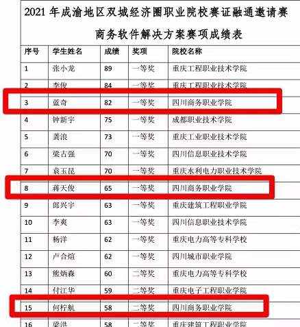 近日,由重庆智慧物联职业教育集团主办的成渝地区双城经济圈职业院校赛证融通邀请赛商务软件解决方案赛项在渝举行。鸭脖信息技术系蓝奇、蒋天俊同学荣获一等奖, 何柠航同学荣获二等奖,王胜同学荣获三等奖,信息安全专业负责人刘磊和校企共建教师李斌、夏祎忞、罗丹等共同担任参赛指导教师。 据悉,成渝两地共有20余所高职院校参赛,比赛面向产业主流技术、对接国际标准,旨在通过融合世界技能大赛的技术标准和规则...