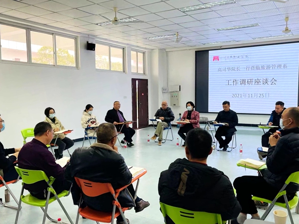 11月25日下午,学院党委副书记、院长高司华在学院党委委员、副院长许丹雅,党委委员、经济贸易系主任朱贵水,质量管理办公室主任刘小平,教务处处长黄松,党政办副主任韦晓东的陪同下来到旅游管理系进行座谈调研,旅游管理系党总支书记陈根元、党总支副书记肖勇、系副主任沈超、系党政办主任王惠琼和旅游管理系各专业责任人、专业群责任人、教工党支部书记、学工党支部书记、教学干事参加了座谈。高司华听取了陈根元关于旅游管...
