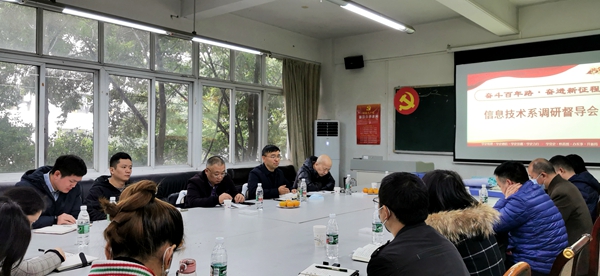 11月26日上午,学院党委副书记、院长高司华,党委委员、经济贸易系主任朱贵水、教务处长黄松、党政办副主任韦晓东、质量管理办公室副主任刘磊一行到信息技术系座谈调研。信息技术系党总支书记冯端、系主任刘能良、副主任黄学军以及信息技术系各专业负责人、部门干事、部分辅导员等参加了座谈。刘能良汇报了信息技术系制度执行年的完成情况,以及教学管理方面的情况;冯端汇报了党史学习情况以及学生管理工作情况;其他老师也汇...