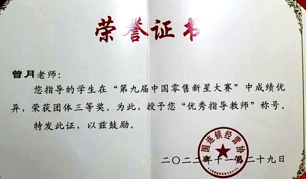 近日,2022年第九届中国零售新星大赛全国总决赛圆满落幕,由经营管理系2020级连锁经营与管理专业王旭、杨文静两位同学组成的参赛队荣获全国三等奖,刘刚、曾月两位老师荣获优秀指导老师。本次大赛由人力与社会保障部牵头,中国连锁经营协会主办,来自全国各区域的近100所高校在校大学生同台竞技。大赛共分三个环节,9月份线下企业市场调查项目、10月份进行理论部分考试及11月份即时零售方案线上汇报与答辩,比赛历时3个月。比...