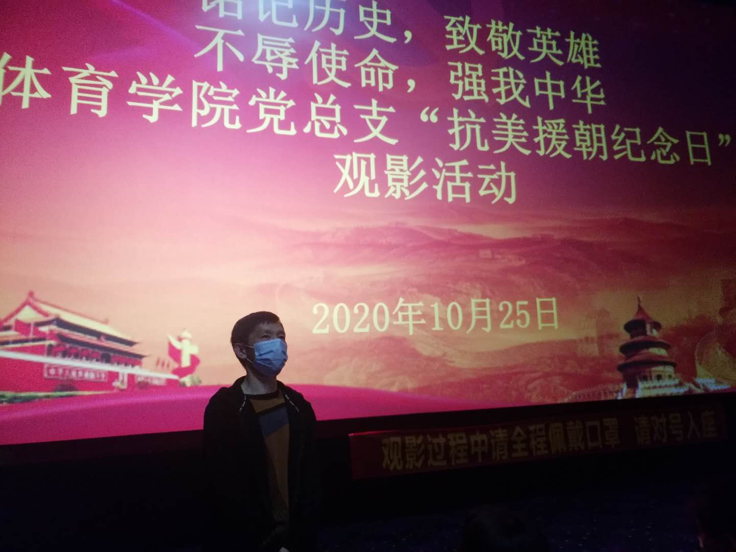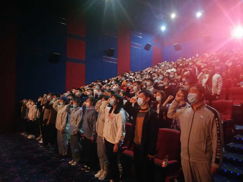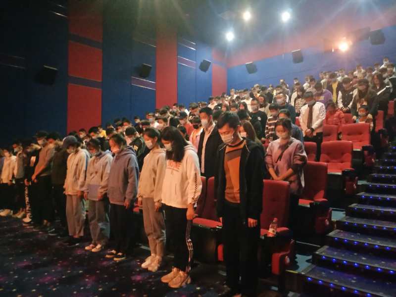 观影前,全体师生举行了简短而又隆重的仪式。首先全体师生肃立高唱国歌,紧接着全体师生向在抗美援朝战争中英勇牺牲的烈士默哀,最后全体师生进行了庄严宣誓。