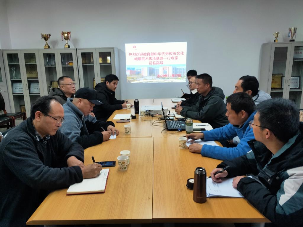20201127日上午,教育部中华优秀传统文化峨眉武术传承基地主任王斌、副主任周勇、崔龙、办公室主任邹万全来贝博官网考察交流。会议在BB贝博艾弗森官方网站会议室举行,会议由院长佘涛主持,彭波、孙亮亮,李进文、马思远、盛佳智、黄亮参加。