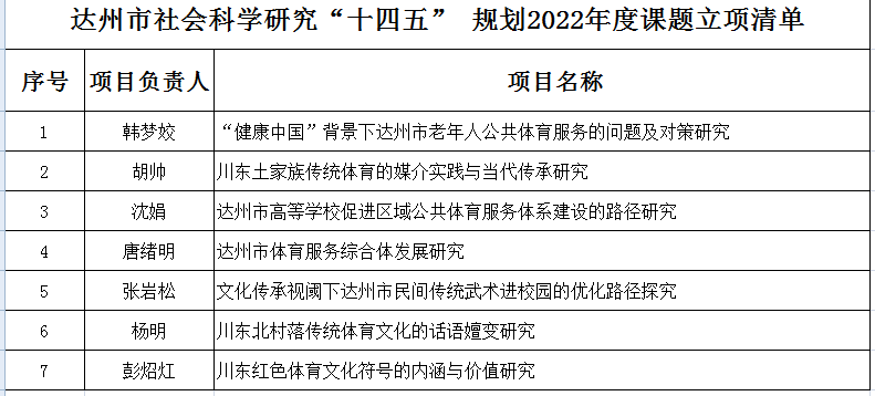 近日,达州市社科联发布了达州市社会科学研究“十四五”规划2022年度课题立项通报,据统计,BB贝博艾弗森官方网站教师共立项课题7项。具体立项名单请参见下表。请各位立项项目负责人认真做好项目研究工作,确保立项按时保质完成。