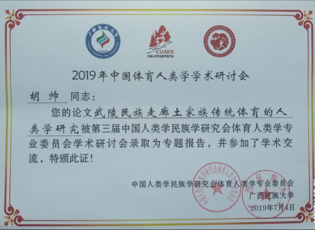2019年7月3日至7日,第三届中国体育人类学学术研讨会在广西民族大学举行。贝博官网青年教师胡帅所投的《武陵民族走廊土家族传统体育的人类学研究》被录取为专题报告,并进行了专题发言。