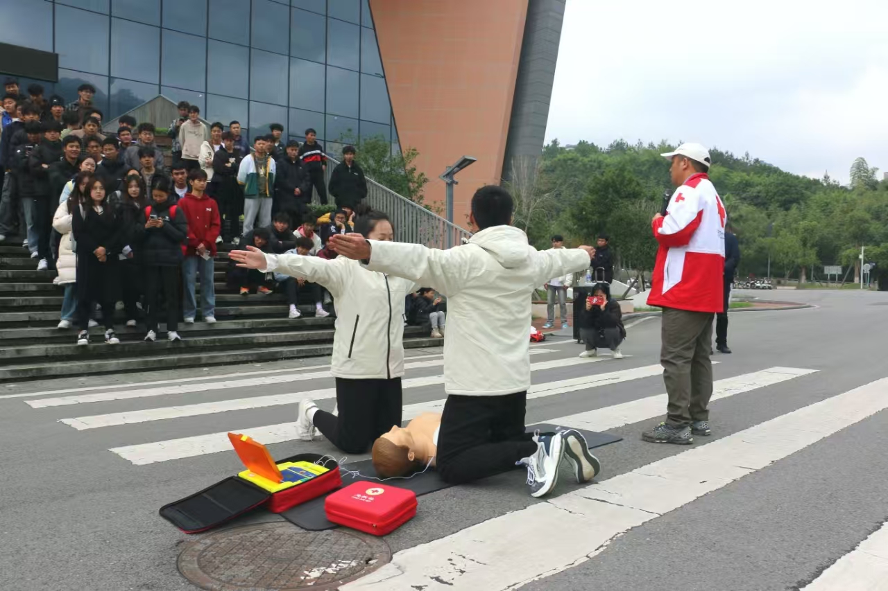 本次演练模拟建筑物火灾场景,警铃骤响后,学生们迅速反应,依指定路线从安全通道有序疏散至室外安全区域,整个过程紧凑高效、安全有序。随后,宋京林率红十字救护员团队进行了消防暨应急救护演练,内容包括上肢受伤、腹部受伤、心脏骤停等情况的应急处置,灭火器与消防水带的使用方法以及火灾逃生的基本常识。