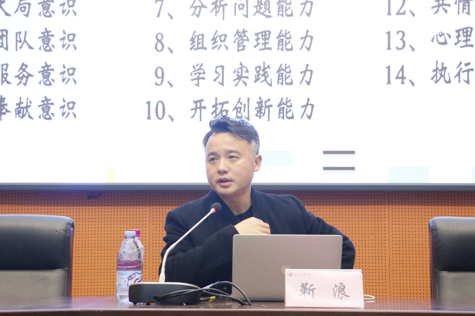 2024 12 11 16:30, 学院团总支在学术报告厅B厅举办了“宝剑锋从磨砺出——谈谈学生干部的自我修养”为主题的讲座,党委副书记靳浪担任主讲,团总支学生会干部、干事和各班班长团支书参会。讲座由学工办主任兼团总支书记祝利平主持。