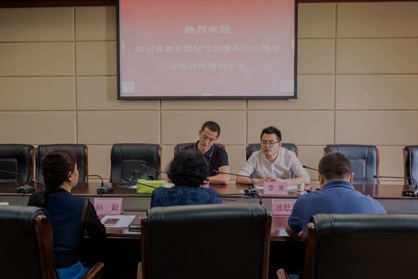 5月17日上午,四川省教育国际交流服务中心的副主任王拉沙、出国事务部部长李果到鸭脖开展“大学习、大讨论、大调研”活动。学院党委委员、副院长许丹雅,国合中心副主任孙毅及国合中心全体人员参加。