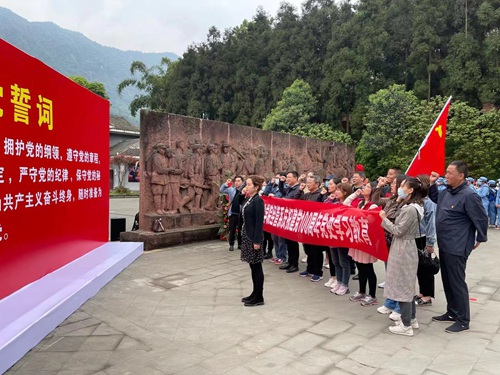 参加活动的梁栋、朱永泉、何俊烨、李翼向红军先烈敬献了花篮,大家集体默哀悼念。全体党员现场重温了入党誓词。大家认真参观了红军过邛崃的各个历史阶段图片和历史遗物,聆听了讲解员对红军长征过邛崃史实的介绍。在对革命先驱者的敬仰和缅怀中,一张张珍贵的历史图片、一幅幅生动的绘画作品、一尊尊栩栩如生的雕塑、一份份详实的文献资料,将大家带回那艰苦卓绝、激情洋溢、抛头颅洒热血的峥嵘岁月,感受了革命前辈的英勇事迹和他们为革命事业奋不顾身的崇高精神。