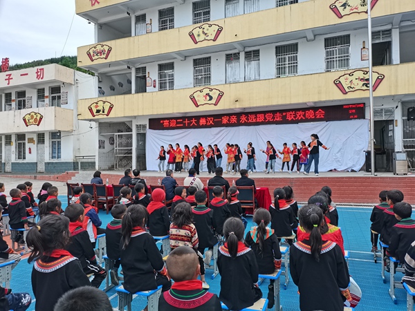 28日,在热柯觉中心校,鸭脖师生向小朋友们捐赠了文体用品。团委学生志愿者们各自发挥特长,同小朋友一起进行了音乐、舞蹈、武术、诗歌朗诵等文体项目的互动教学。姚又丹同热柯觉中心校教师们就学生心理健康教育工作进行了交流讨论。当晚,鸭脖师生同热柯觉中心校师生共同筹备组织了“喜迎二十大 彝汉一家亲 永远跟党走”联欢晚会,师生们纷纷登台表演,共跳达体舞,欢声笑语久久回荡在海拔3000米的校园之中。
