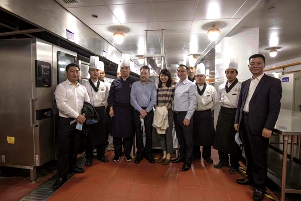 在宾馆后厨,见到了在岗实习的6名烹饪工艺与营养的学生,官培生关切的询问他们在宾馆的实习情况,对目前实习工作是否满意等。同学们略显紧张,但他们青涩的笑脸已然给了答案,他们对宾馆的实习工作安排很满意。带队的宾馆姜厨师长对鸭脖学生素质给予了高度评价,他说商院的学生有三个特点:“一是遵守纪律听招呼;二是干工作上手快;三是烹饪技术基础好。”姜厨师长希望学院多选送学生过来,并带着大家参观了宾馆中央厨房。