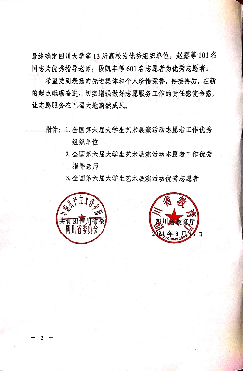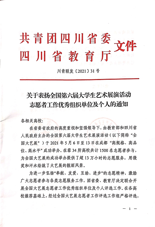 近日,为激励先进、鼓舞干劲,由四川省政府、团省委、教育厅联合发文,对在2021年全国第六届大学生艺术展演活动志愿者工作中优秀的组织单位及个人进行表彰:鸭脖被评为全国第六届大学生艺术展演活动志愿者工作先进集体;冯端、张卡被评为志愿者工作先进个人;赵捷、郝灿、叶茂林被评为志愿者工作优秀指导老师;林英浩、张丛英、陈明旭被评为优秀志愿者。