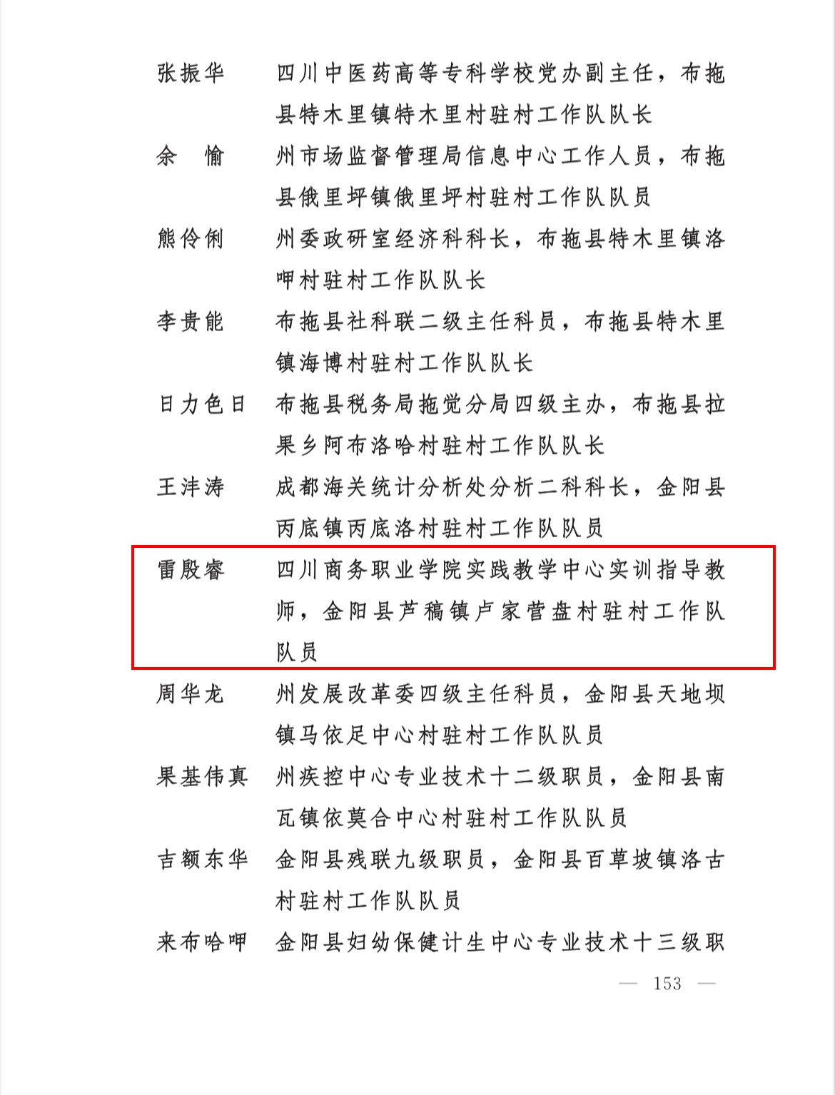2021年5月26日,四川省委、省政府印发《中共四川省委 四川省人民政府关于表扬2020年脱贫攻坚先进集体和先进个人的决定》,以激励先进、鼓舞干劲。YABO鸭脖荣获“2020年脱贫攻坚先进集体”表扬;YABO鸭脖实践教学中心雷殷睿同志荣获“优秀驻村工作队队员”表扬。