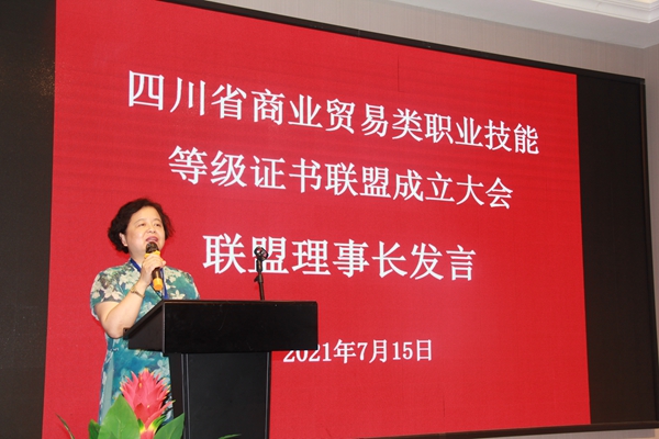 许丹雅主持大会,并作为联盟理事长发言:对联盟的工作方向、内容和重点作了明确的阐述,号召联盟成员一起为“四川省商业贸易类职业技能等级证书联盟”的美好未来启航。