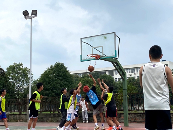 篮球赛由系上送10支队伍进行5场比赛。在比赛开始之前,经济贸易系党总支书记管齐峰及部分教师到篮球场上为运动员们加油打气。运动健儿们,在运动场上展示着矫健身姿,挥洒汗水!同学们站在篮球场旁,鼓足了劲为选手们加油!双方队员你争我夺,你攻我守,巧妙的传球、华丽的转身、精彩的投篮、完美的合作,贏得了场下队员们的阵阵喝彩。