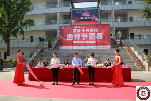 5月11日上午9:30,由学院工会和旅游管理系主办,四川乡村基有限公司承办的首届“乡村基杯”厨神争霸赛在学院振华广场隆重举行,学院党委书记唐柯,党委委员、副院长许丹雅、党委委员、副院长官培生,党委委员、纪委书记李文川,乡村基集团品牌负责人刘丽、四川公司总经理张娟、行政总厨胡林以及学院各职能部门负责人出席了本次大赛。
