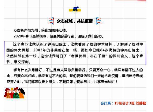 “火神山,雷神山,方舱医院,武汉封城;国内:支援队一省包一市,国外:一省救一国。此次支援,‘凝聚中华磅礴之力,下好全国一盘棋’,充分地体现了全国人民的大团结,作为一名中国人,我感到非常自豪。”“万众一心战疫情”资助征文活动一等奖获得者会计系罗徐克同学在征文里由衷地感叹道。5月13日,由学生资助中心举办的征文活动顺利结束。