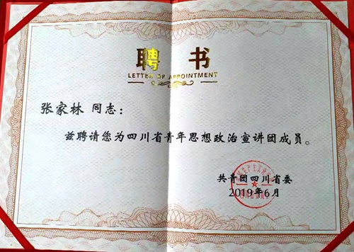 据悉,四川省青年思想政治宣讲团讲师配备党代表、团代表、专家学者、思政教师等青年讲师近200人,分别来自全省政府机关、高等院校、企业、科研院所等单位。在接下来的三年宣讲活动中,张家林老师与其他讲师一道,紧扣时代主题和热点问题,结合自身工作实际和专业特长,强化思想引领,向全省青年讲好中国故事,讲好青春故事。