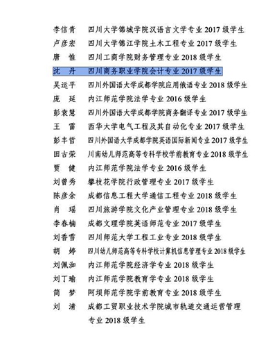 学院2017级会计专业沈丹同学,在内江市参与2019年“逐梦计划”活动中表现突出,受到共青团内江市委、中共内江市直属机关工作委员会、内江市人力资源社会保障局等部门联合表彰。