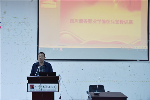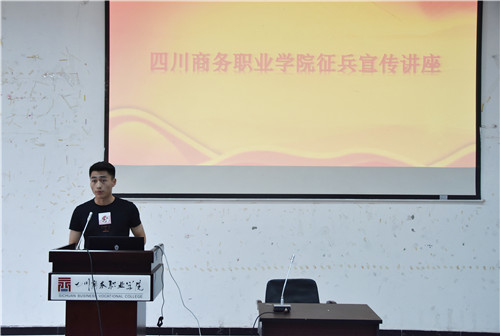 和盛镇武装部代俊同志解读了大学生当兵入伍政策,对国防建设的形势、兵役登记工作做了详细介绍,参军入伍是大学生成长成才的重要人生经历,鼓励商院男儿们踊跃参加。2017级旅游管理系休闲体育班退役复学士兵何海洋同学分享他在军营生活中的感受和体会,他描述的“眼睛一睁,忙到熄灯”的军营真实写照,让同学们深切的感受到军人的付出与收获,他鼓励商院青年们趁年轻立定尚武志,去投身军旅中,披肝沥胆,壮我中华,做一名顶天立地的有为青年。学生事务中心扶祖霞同学分享了她对入伍资助政策的理解。