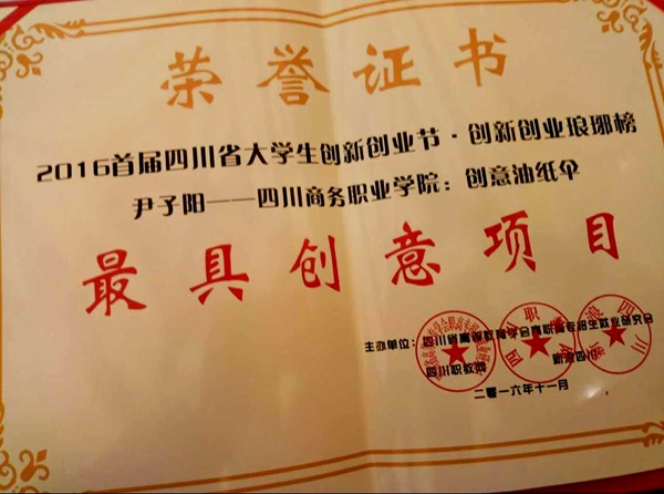 11月4日,鸭脖2014级环境艺术三班尹子阳的创意油纸伞项目在2016四川省大学生创新创业节创新创业琅琊榜上获得最具创意项目奖。