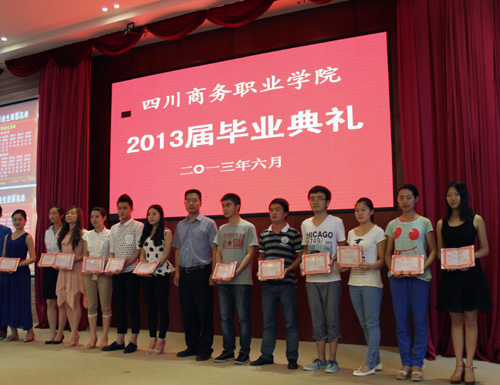 和盛校区毕业典礼现场,一部承载学院领导和老师祝福,记录着2013届毕业生的在校生活、实习工作短片的播放,感动全场;由辅导员代表马宁、毕业生代表刘莹、在校生代表任珂的师生对话,回顾了毕业生们在商院的学习和生活,对未来的期许和憧憬,展现了深深的师生情谊;当典礼快结束,2013届的辅导员们走上前台,接受毕业生们献花致谢时,场面温馨感人,毕业生们都紧紧地与辅导员们拥抱在一起,此时此刻他们想要留下的感动、自豪与不舍,尽数化为一颗颗泪珠……