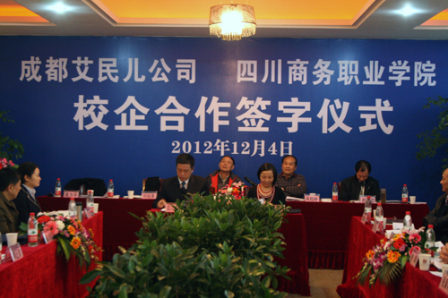 2012年12月4日上午,学院和盛校区行政楼第六教学楼6205室隆重举行了鸭脖与成都艾民儿皮制品有限责任公司校企合作的签字仪式。出席签字仪式的有省商务厅领导呙相林副巡视员、孙跃华处长、乔方处长、赵大伟调研员,校外知名学者李达昌教授,以及成都艾民儿皮制品有限责任公司刘琼英董事长、顾正清副总经理、李英秘书长,学院党委书记舒维霖、院长高力平、副院长郎松亭、吴扬、向宏志、张军、纪委副书记张家祥以及学院部分中层干部、艺术系教师代表和学生代表。签字仪式由学院向宏志副院长主持。