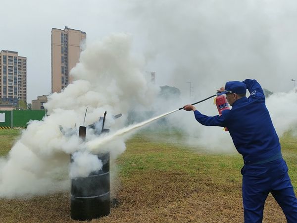和盛消防站副站长、黄田坝消防中队副中队长为参演师生详细讲解了消防安全知识和灭火器的正确使用方法,并现场示范了如何正确使用灭火器。在消防员的指导下,参演师生、食堂工作人员纷纷上场进行“灭火”实战。