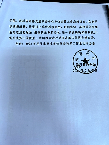 学院财务资产管理处履职尽责,严把数据关,圆满完成了2022年度决算编制及公开等各项工作,近日获四川省商务厅通报表扬。