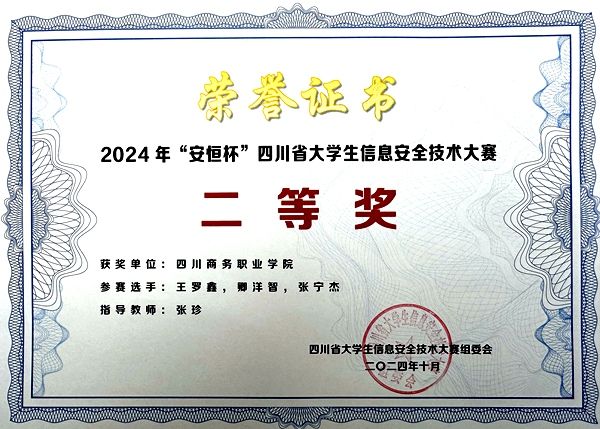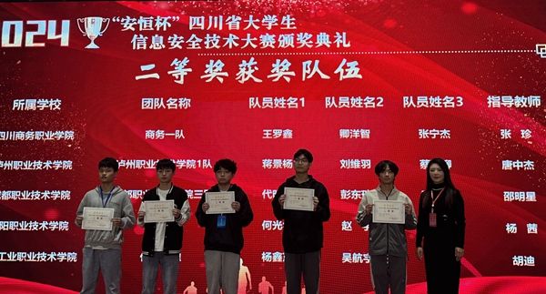 近日,由四川省教育厅主办,中共四川省委网信办和四川省公安厅协办的2024年“安恒杯”四川省大学生信息安全技术大赛在成都信息工程大学双流新型产业学院举行,鸭脖信息技术系张珍老师指导的商务一队斩获二等奖。