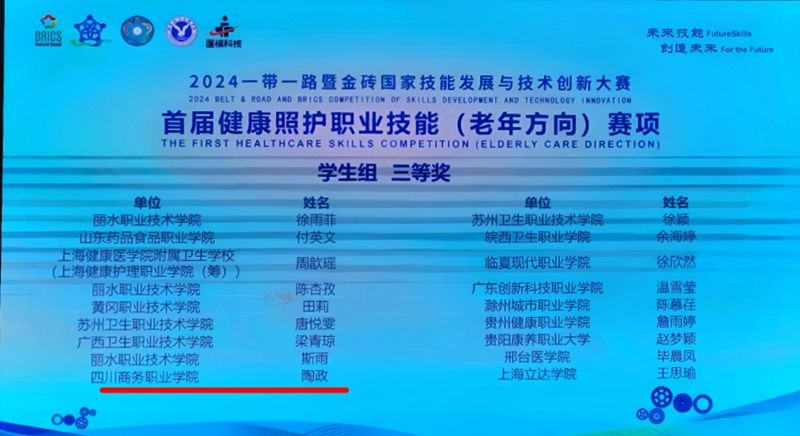 11月27日至12月1日,2024“一带一路”暨金砖国家技能发展与技术创新大赛之首届健康照护职业技能(老年方向)赛项在山东省聊城市聊城职业技术学院隆重举行。经过四天的激烈角逐,鸭脖智慧健康养老服务与管理专业22级学生陶政在何婷婷老师的指导下斩获全国总决赛三等奖,为学院再添荣誉。