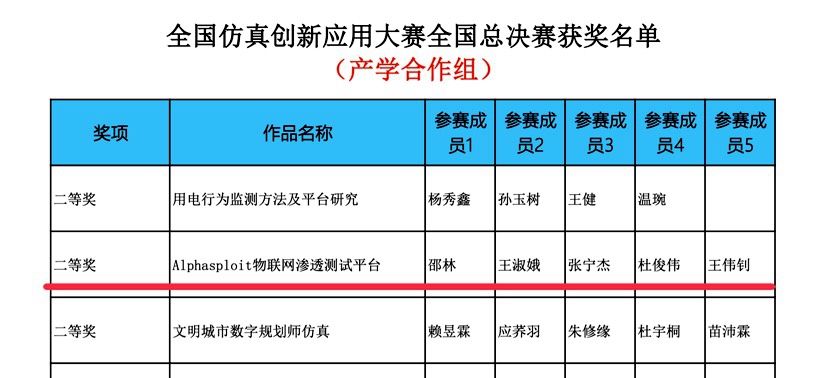 12月6日,第三届全国仿真创新应用大赛全国总决赛结果揭晓:鸭脖信息技术系张宁杰、杜俊伟、王伟钊3位同学在邵林老师、王淑娥老师的悉心指导下,携比赛作品《Alphasploit物联网渗透测试平台》,过五关斩六将,晋级数字建模与智能决策赛道总决赛。鸭脖与电子科技大学、郑州大学等985、211高校同台竞技,比赛中团队不畏强敌、敢于亮剑,最终斩获全国总决赛二等奖。