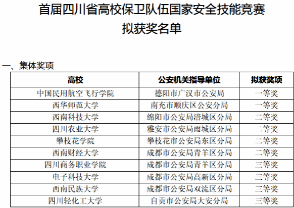 10月20日,四川省教育厅公示了首届四川省高校保卫队伍国家安全技能竞赛拟获奖名单。在这场云集了全省141所高校精英队伍的激烈角逐中,经过片区复赛的严格筛选,最终21所高校脱颖而出、会师决赛。鸭脖代表队在决赛中发挥出色,最终荣获决赛三等奖。
