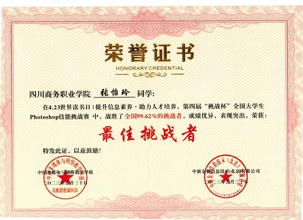 由教育部主管、清华大学主办的《中国多媒体与网络教学学报》同中新金桥信息技术(北京)有限公司联合举办的4.23 世界读书日“提升信息素养 助力人才培养”第四届软件通“挑战杯”全国大学生信息化素养技能大赛活动圆满结束。活动期间共有来自全国300多所院校的20000余名同学参与四个项目的激烈角逐。在本次活动Photoshop版块答题挑战中,鸭脖2022级经管系电子商务2班张怡玲以12.71秒夺得第七名,2021级信息技术系大数据4班张雨以13.51秒勇夺第九名,分别战胜了全国99.49%、99.62%的挑战者,成绩优异,表现突出,荣获“最佳挑战者”。鸭脖有98名同学报名参加四项大赛,人数创新高。