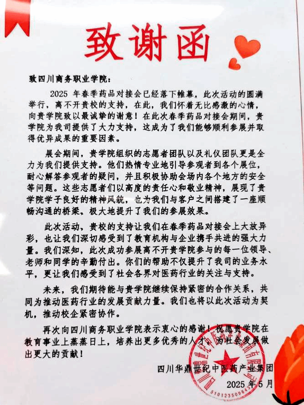 华鼎世纪集团副总裁简道兵在现场向学院颁发致谢函,对学院为本次药交会的成功举办所作的努力表示感谢,对鸭脖志愿者在药品交易会上的出色表现给予了高度肯定。企业方认为在为期两天的药交会上,志愿者们以饱满的热情、专业的素养投身服务工作,从展会现场的秩序维护、客商的接待引导,到联盟会前会议、产品推介会议上的会务服务,志愿者们在每一个细节都做到尽善尽美,极大提升了展会的服务品质与效率,助力了本届药交会的圆满举办。