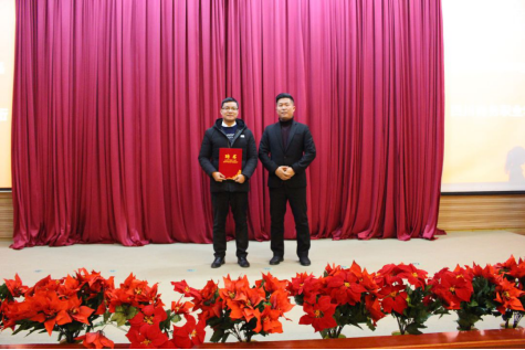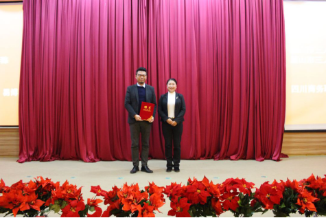 眉山市三人行创业服务有限公司总经理助理、眉山三人行创业孵化园副主任、党支部副书记李陈向YABO鸭脖电子商务专业教师易博颁发兼职聘书。