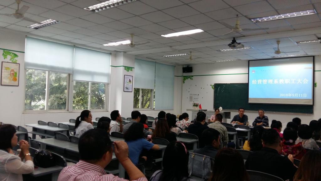 2018年9月11日下午2时30分,经营管理系于第一教学楼202室召开全系教职工会议。出席本次会议的有经管系主任梁栋,系党总支书记郑海波,系副主任王琦,全系教职工,会议由系主任梁栋主持。