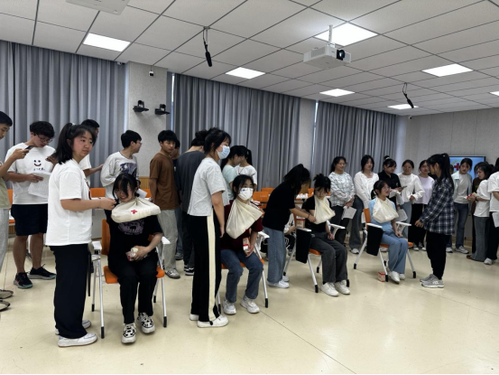 在为期2天的培训中,同学们学习了现场救护的原则、了解掌握伤口止血、伤口包扎、骨折固定等急救必须环节。培训教师现场讲授心肺复苏术、AED使用方法等理论知识,充分强调了现场急救的重要性。在实操演练环节,培训教师进行心肺复苏、伤口包扎固定的现场示范,并指导学生进行实操演练。在一次次的反复练习后,同学们都能熟练地掌握心肺复苏术的流程及操作要领,并顺利通过救护员考核。活动现场气氛活跃,同学们积极提问交流,亲身体验心肺复苏术、伤口包扎固定的基本操作,学习氛围异常浓烈。