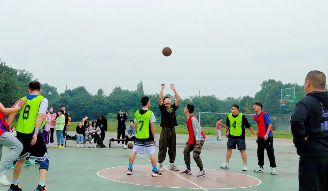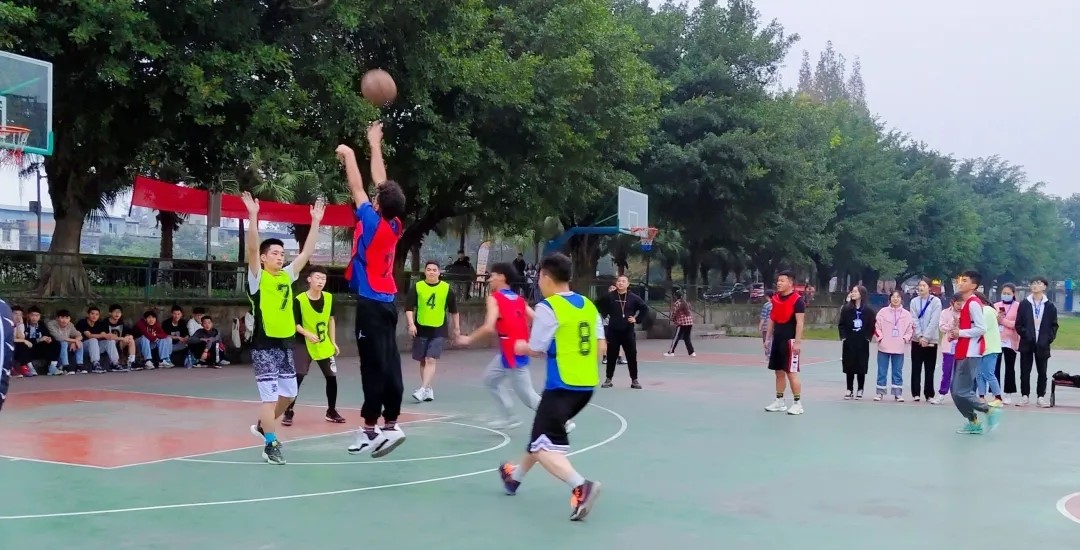 下午五点半在篮球场上便看见穿着红色和荧光绿球服的少年们,他们在检录处进行检录后便开始热身,为接下来的篮球比赛做最后的准备。