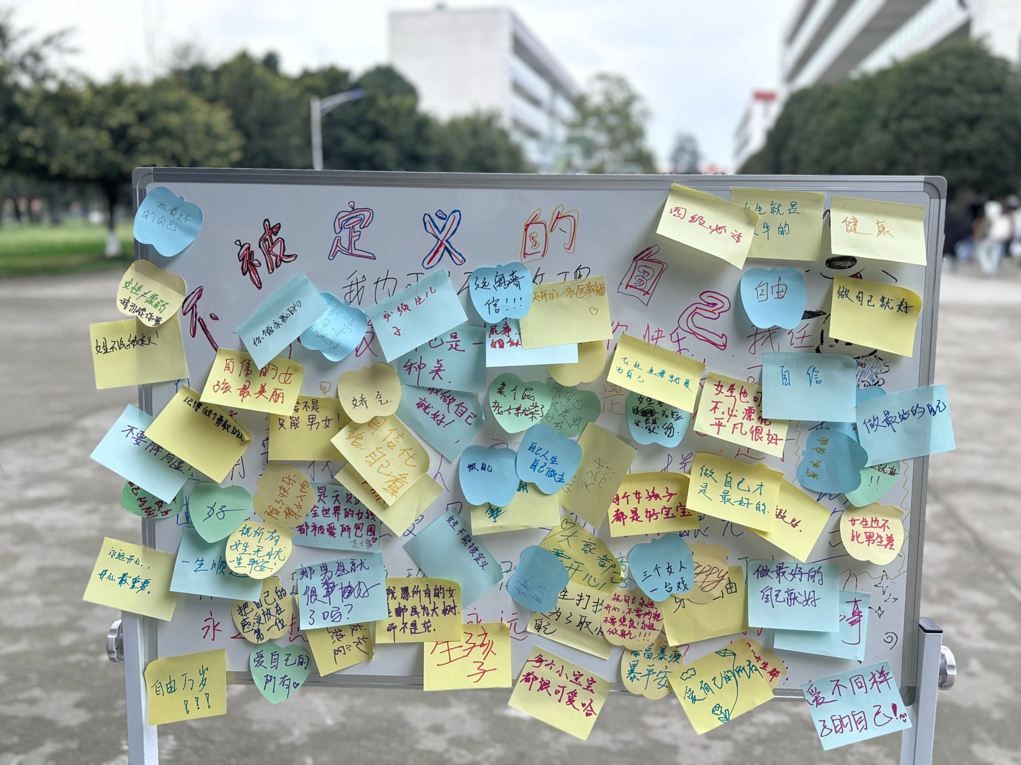 活动现场,大家纷纷拿起马克笔,亲手撕下那些束缚自我的刻板印象标签后写下对自己的寄语:“勇敢追梦,做最好的自己!”、“相信自己,无所不能!”……每一句话都充满了力量与希望。随后,大家将寄语贴在“不被定义的自己”展示板上,并领取了鲜花或棒棒糖,脸上洋溢着自信的笑容。