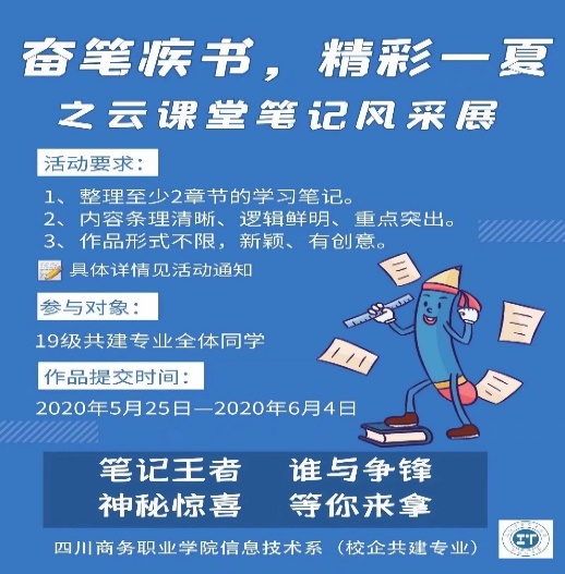 2020年6月,为不断丰富同学们云端学习的趣味性,展示学生线上学习成效,提高课堂学习质量,树立学习榜样,营造一股和谐向上的学习风气,故面向信息技术系19级校企共建专业全体学子,开展了此次“奋笔疾书,精彩一夏”之云课堂笔记风采展的特色活动。